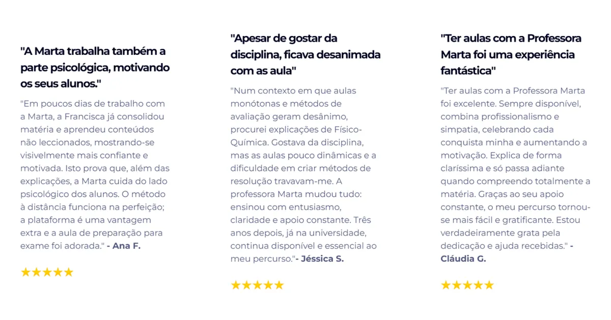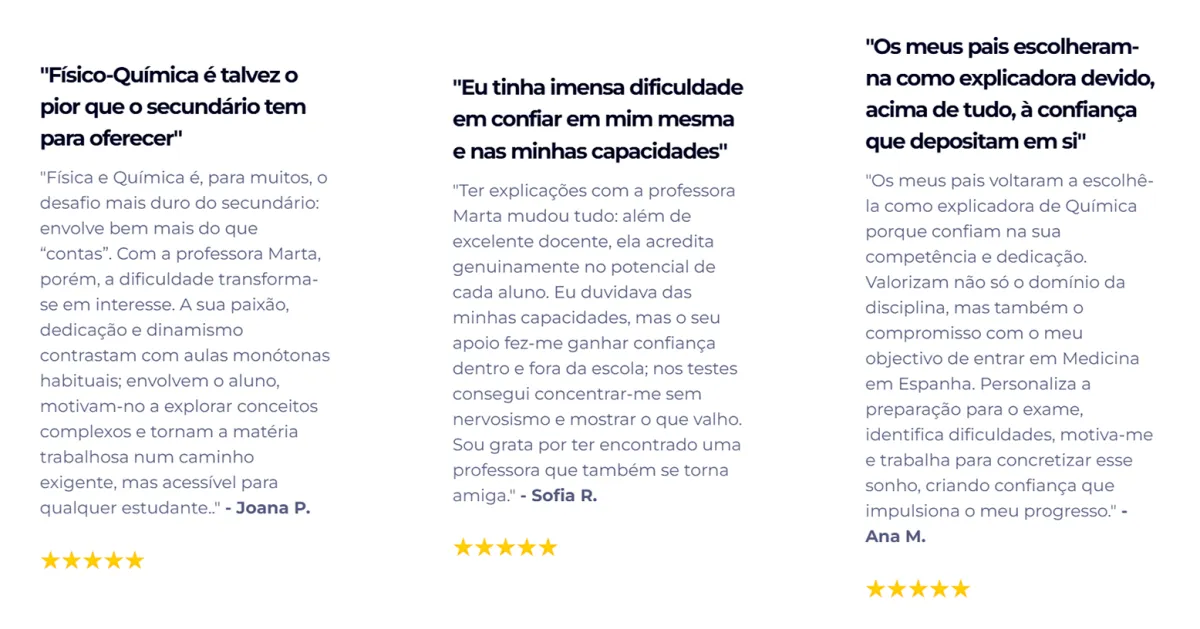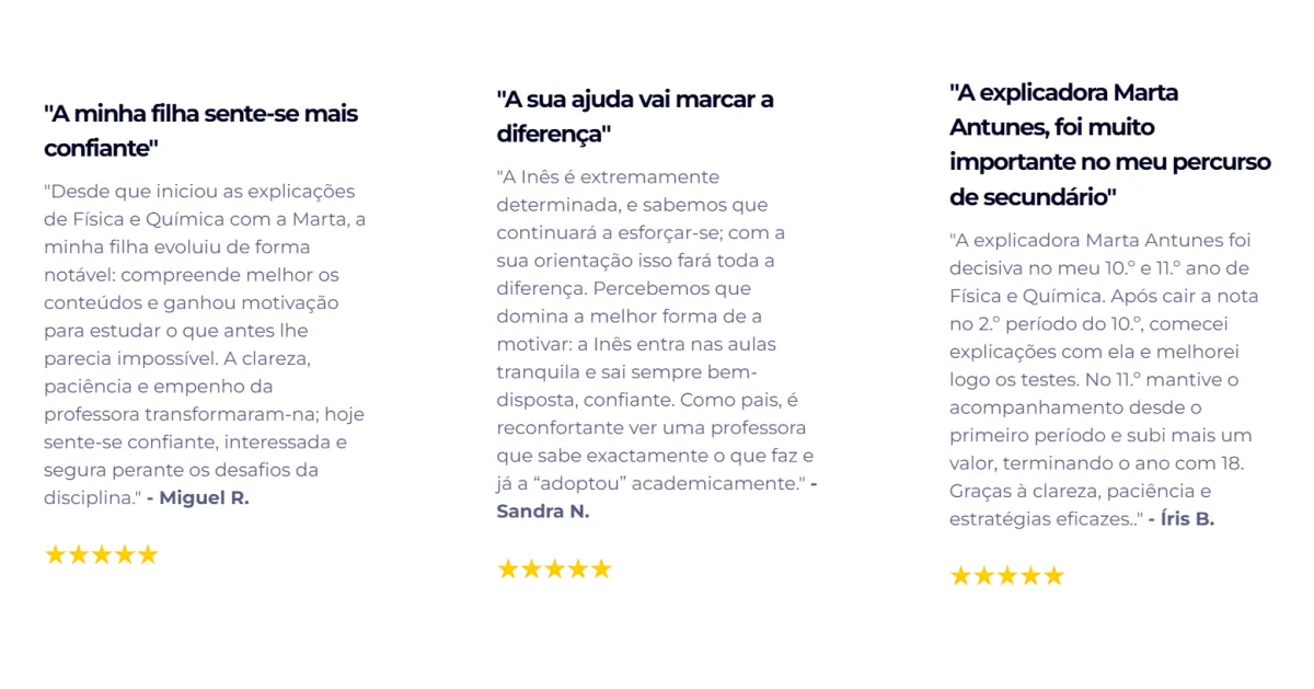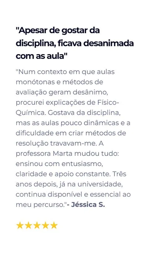 Foco científico + emocional - ensino raciocínio e, em paralelo, técnicas de gestão de ansiedade para que o conhecimento não fuja quando o relógio começa a contar.